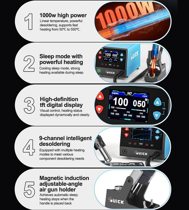 QUICK M7 1000W STAZIONE DISSALDANTE INTELLIGENTE AD ARIA CALDA 110V / 220V TEMPERATURA 50-500°C